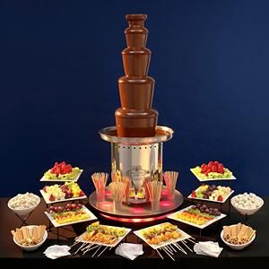 ¿Cómo funciona? Se trata de una máquina que hace correr el chocolate por su interior, lo deja fluir en forma de cascada en el exterior y finalmente cae en su base. El chocolate es previamente derretido y una vez colocado en la máquina, se pueden sumergir en él frutas, golosinas y galletitas.